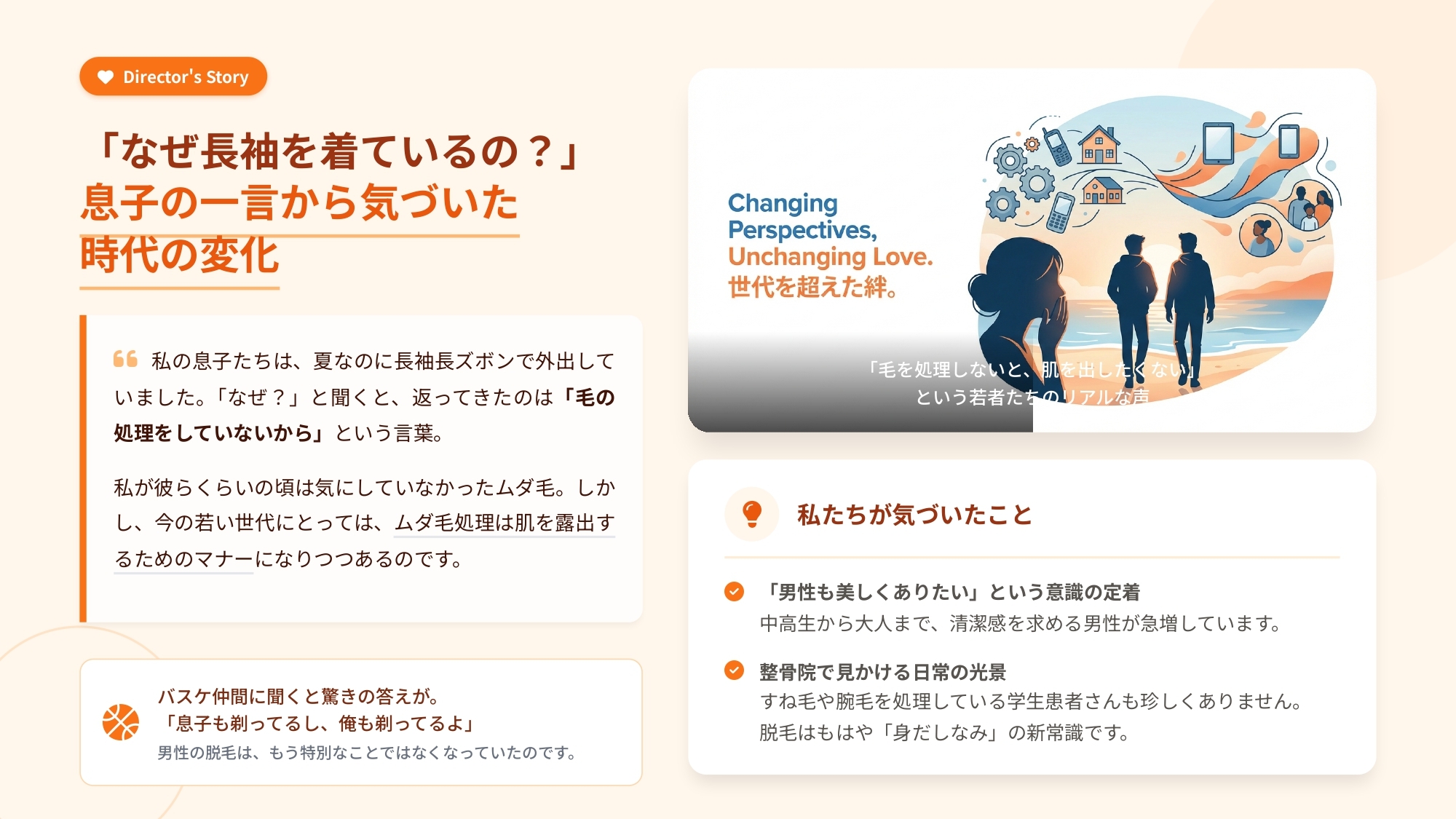 その一言に、私は驚きました。私が彼らくらいの年齢だった頃は、ムダ毛なんて全く気にしていませんでした。しかし今の若い世代にとって、ムダ毛処理は「肌を露出するためのマナー」になりつつあるのです。
