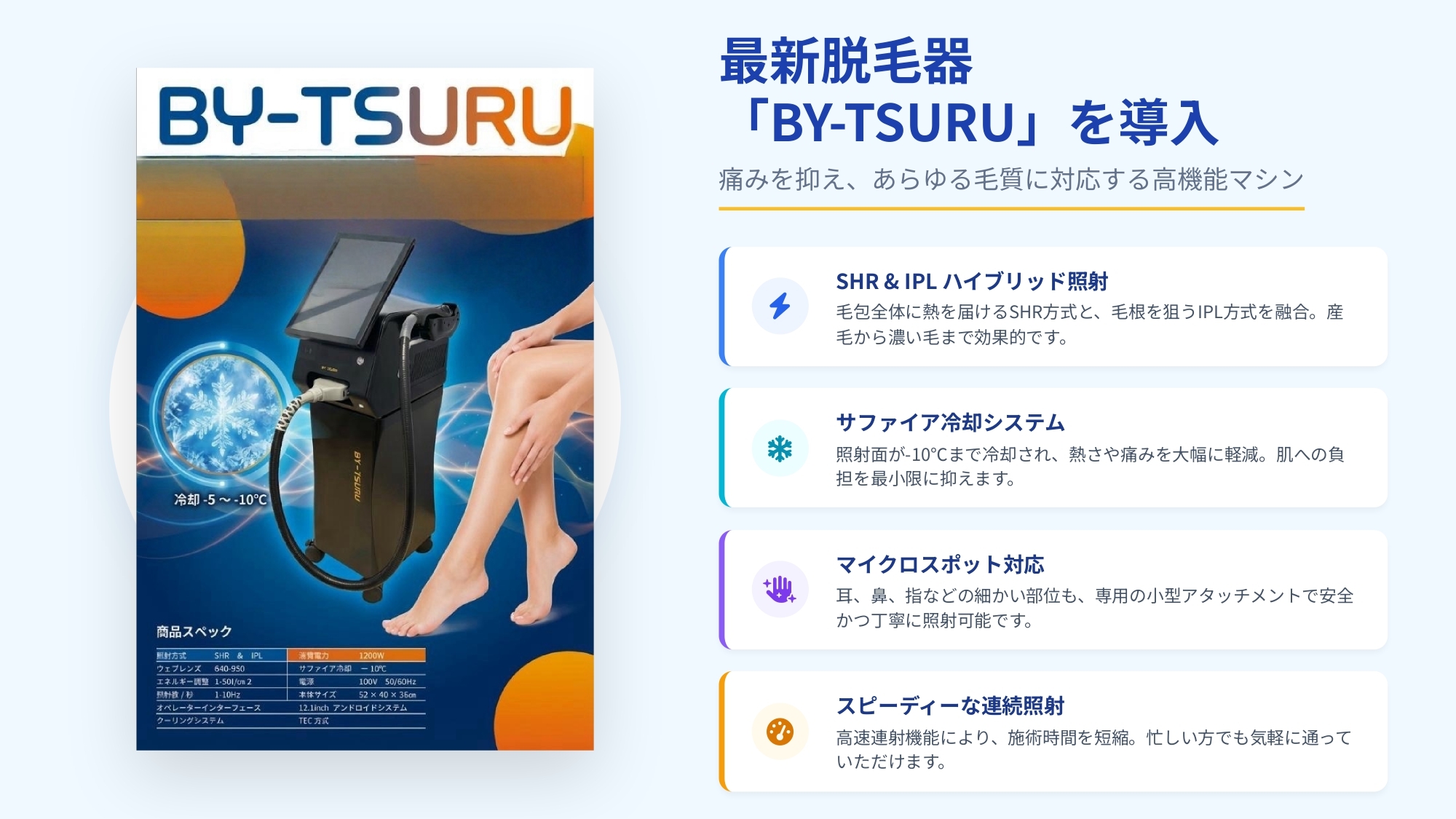 当院では、美容脱毛業界の最先端技術を搭載した脱毛器「BY-TSURU」を導入しています。従来の脱毛器では難しかった産毛から濃い毛まで、あらゆる毛質に対応し、痛みを極限まで抑えた快適な施術を実現します。