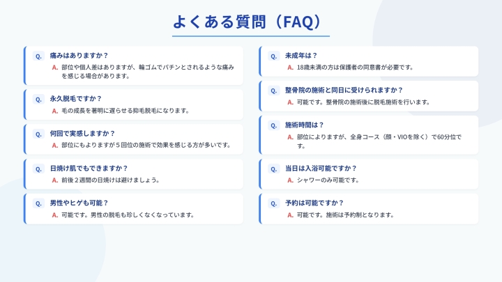 A. はい、可能です! 整骨院での施術後に、続けて脱毛施術を受けていただけます。「ついでに脱毛もできる」という利便性が、当院の大きなメリットです。