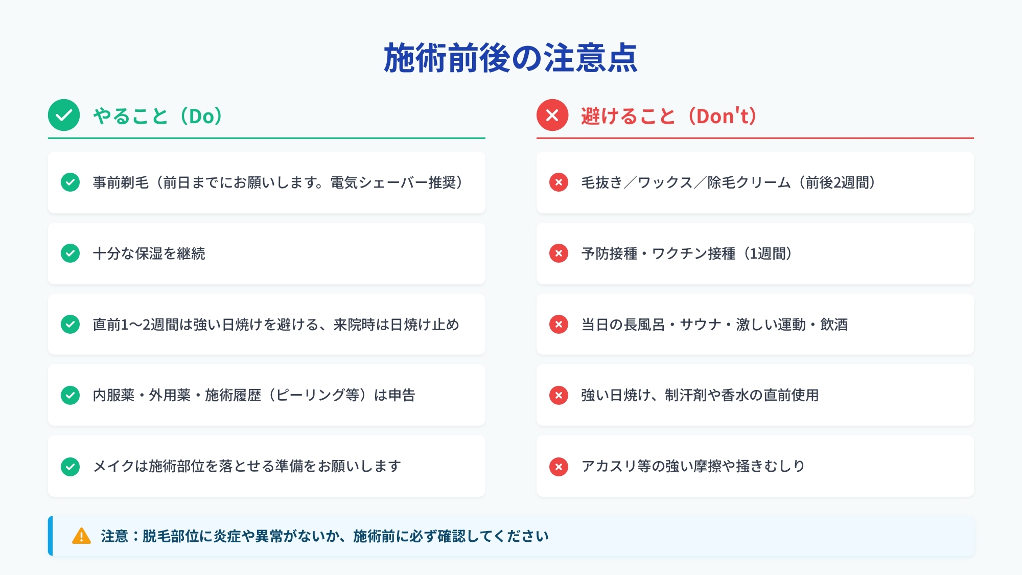 脱毛効果を最大限に引き出し、肌トラブルを避けるために、施術前後の注意点を守っていただくことが大切です。施術前に、脱毛部位に炎症・傷・異常がないか必ず確認してください。少しでも気になることがあれば、遠慮なくスタッフにお申し出ください。