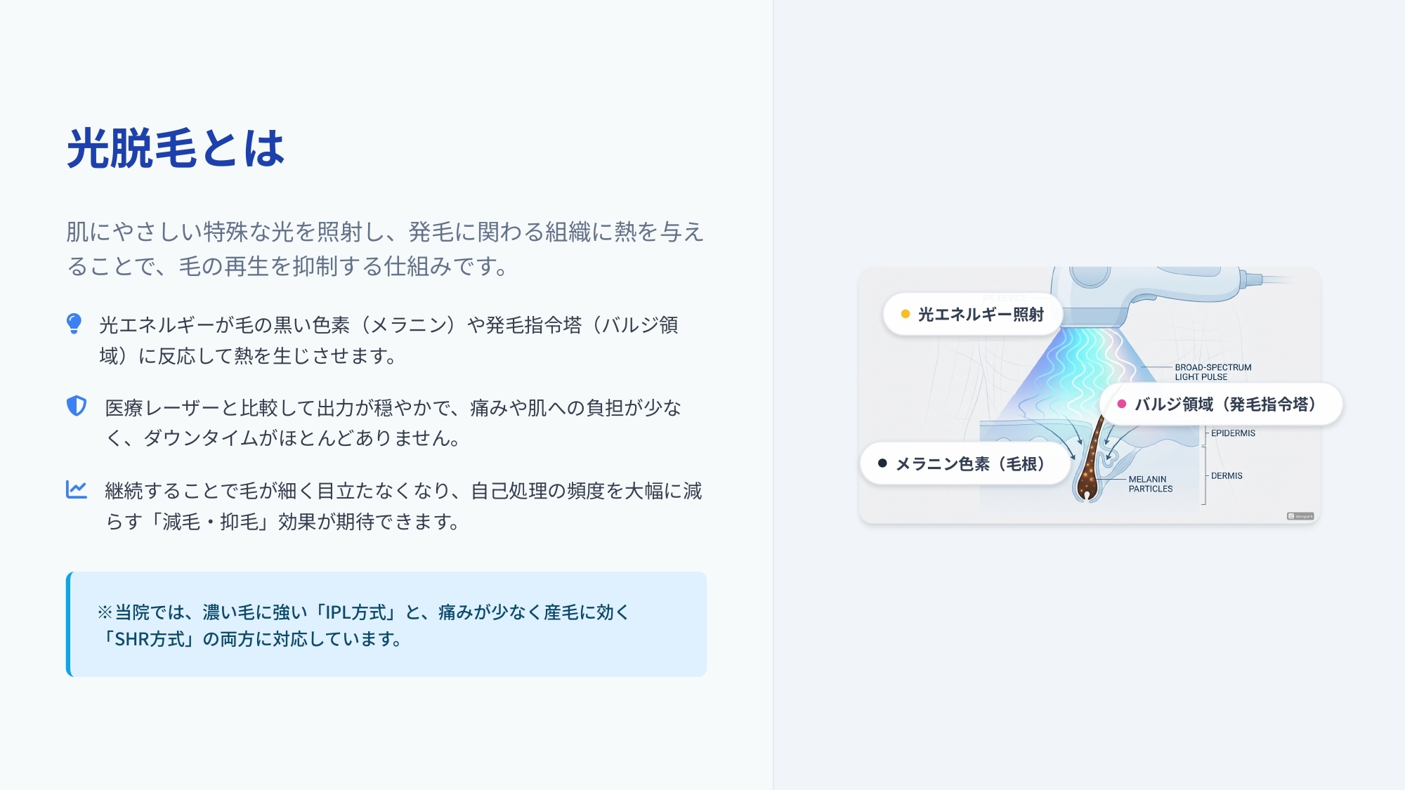 継続的な熱ダメージにより、毛母細胞・毛乳頭・バルジ領域(発毛の指令を出す組織)が損傷します。これによって発毛の指令系統が遮断され、新しい毛が生えにくくなります。特にバルジ領域へのアプローチは、SHR方式の施術で効果的に行うことができます。