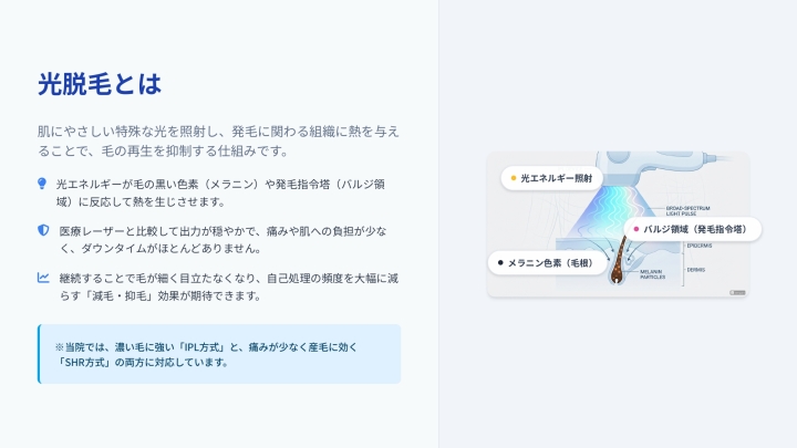 光脱毛は、肌にやさしい特殊な光を照射することで、発毛に関わる組織にアプローチする美容技術です。医療機関で使用されるレーザー脱毛とは異なり、より穏やかな出力で肌への負担を最小限に抑えながら、確実な減毛・抑毛効果を実現します。