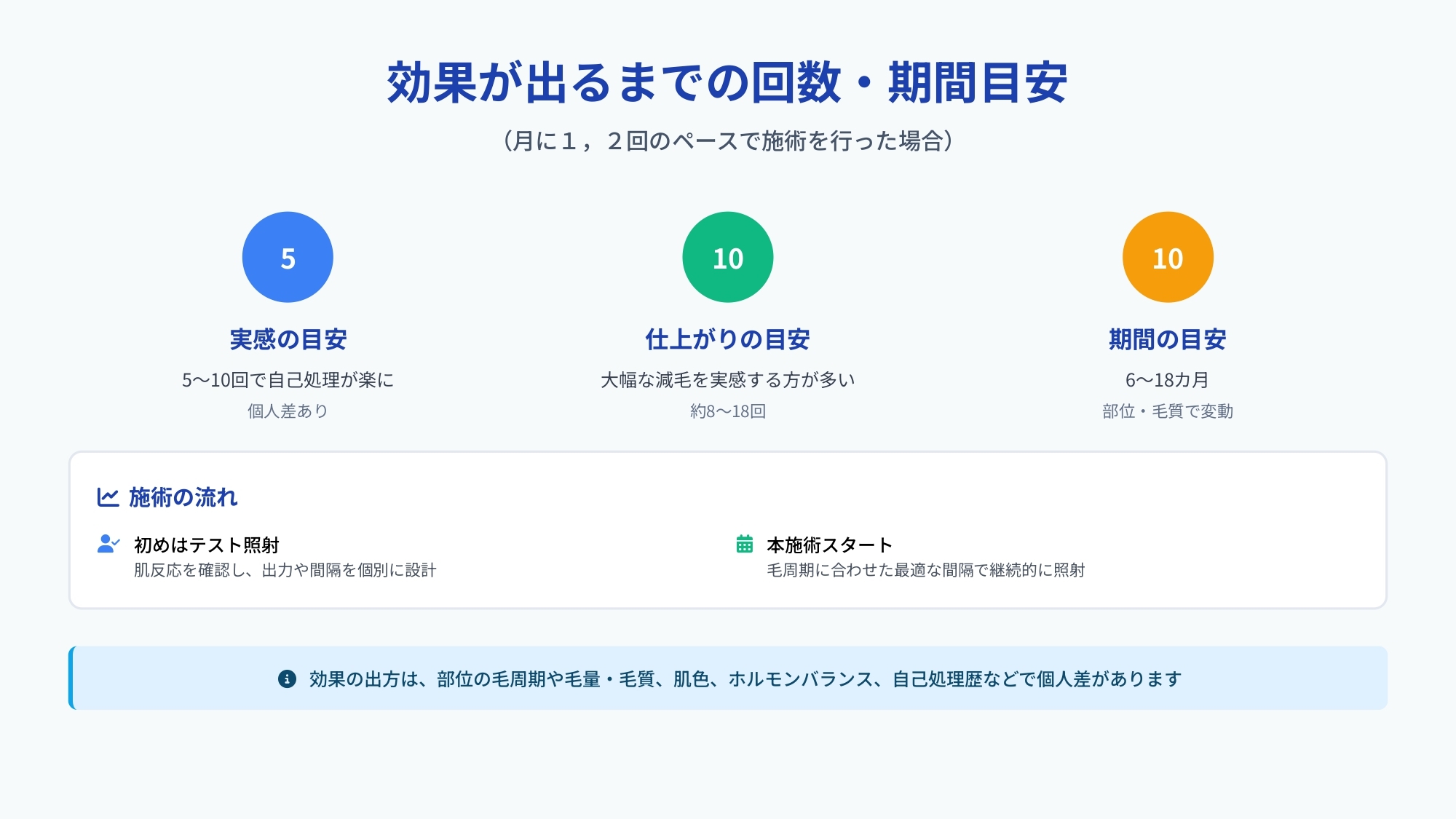脱毛効果の出方には個人差がありますが、一般的な目安をご紹介します。月に1〜2回のペースで施術を継続した場合の参考としてください。