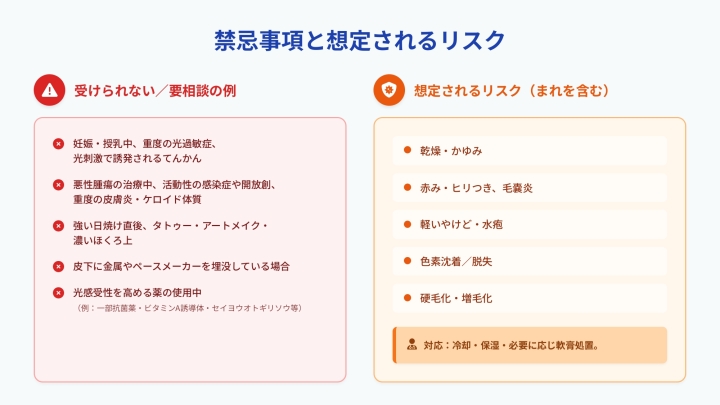 光脱毛は比較的安全な美容施術ですが、一部の方や状況では施術をお受けできない、または要相談となる場合があります。また、まれに起こりうるリスクについても事前にご理解いただくことが大切です。