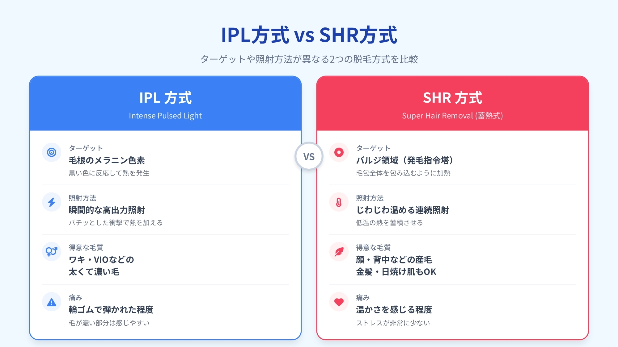 医療レーザー脱毛は高出力で永久脱毛効果がある一方、痛みが強く、肌への負担も大きいのが特徴です。対して光脱毛は、出力が穏やかなため痛みや肌トラブルのリスクが低く、ダウンタイムもほとんどありません。